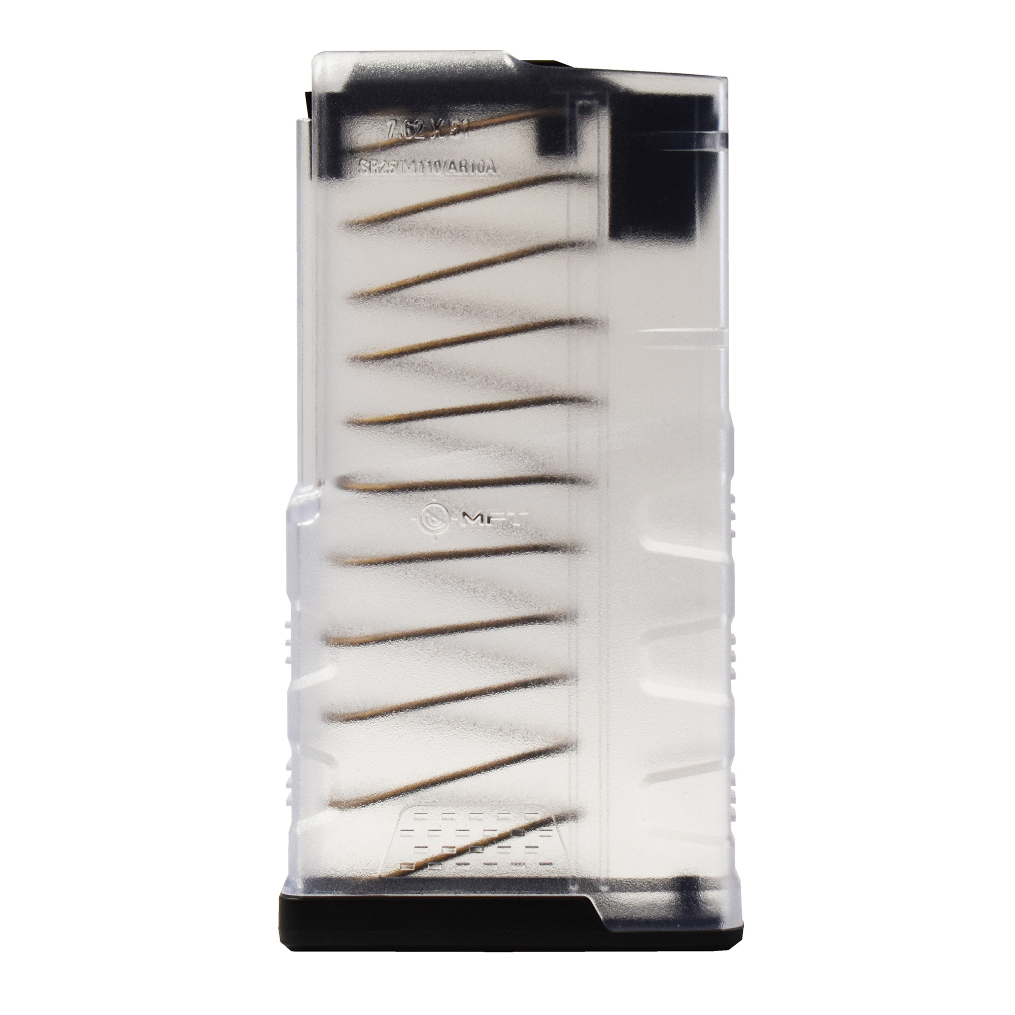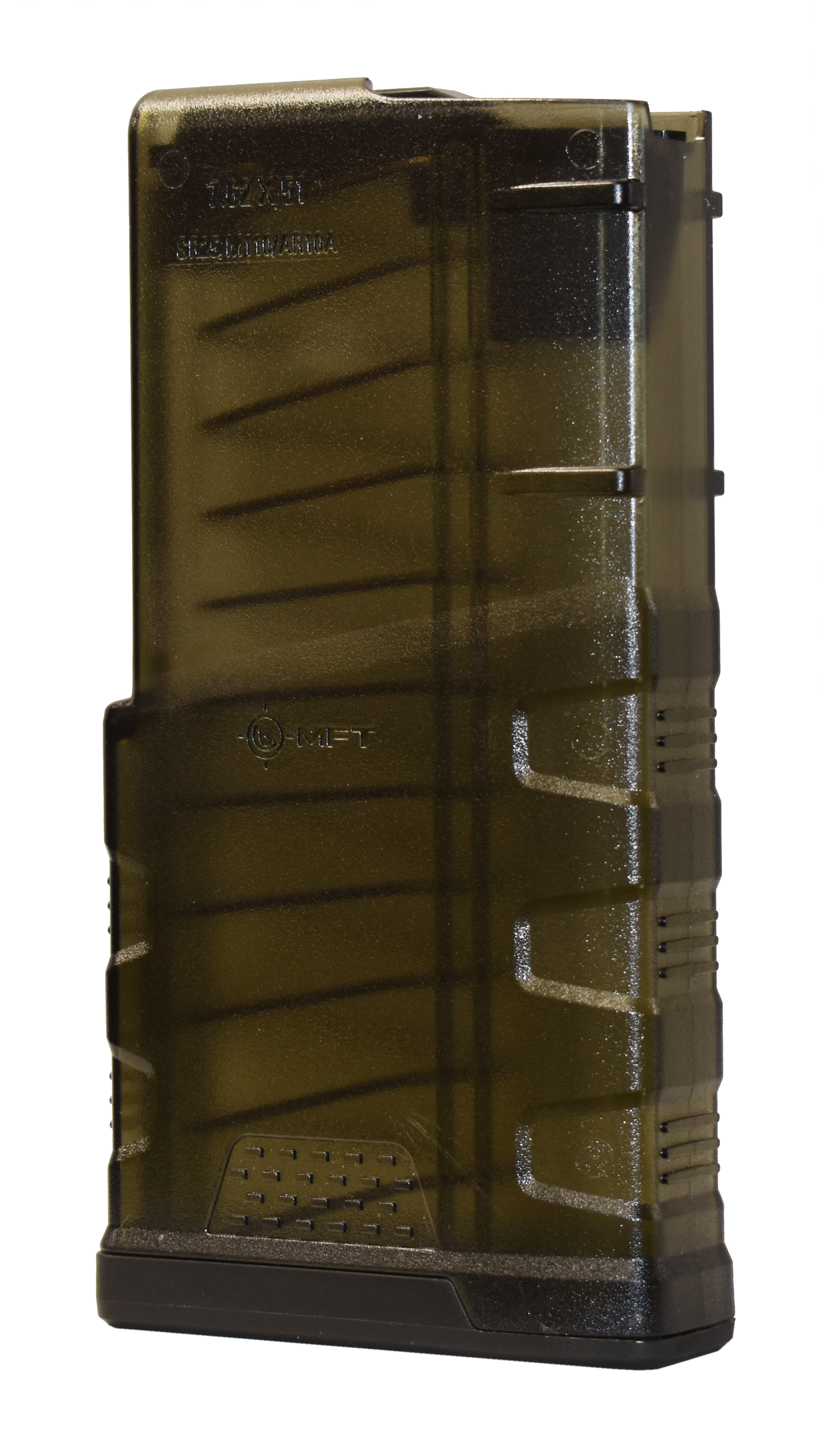 20 round 7.62x51 MFT Translucent EXD Magazine - Clear visual confirmation of round count and ammo type, textured to eliminate shine. Designed for the AR10A/SR25/M110 pattern rifles. Optimized for use with SAAMI-spec 7.62x51/.308 Winchester ammunition. Utilizing new material technology and manufacturing processes for enhanced strength, durability, and reliability to exceed demanding military performance specs.